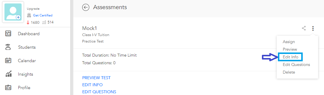 You can edit only those assessments which are created by you. Select an assessment and click the info icon on the right side. On clicking the info icon, you will see the ‘Edit Info’ button.