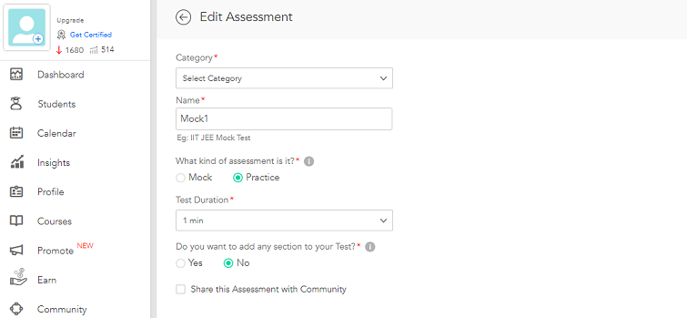 Once you click the ‘Edit Info’ button, you can start editing any of these information - category, name, kind of assessment, test duration, name section and sharing with community.